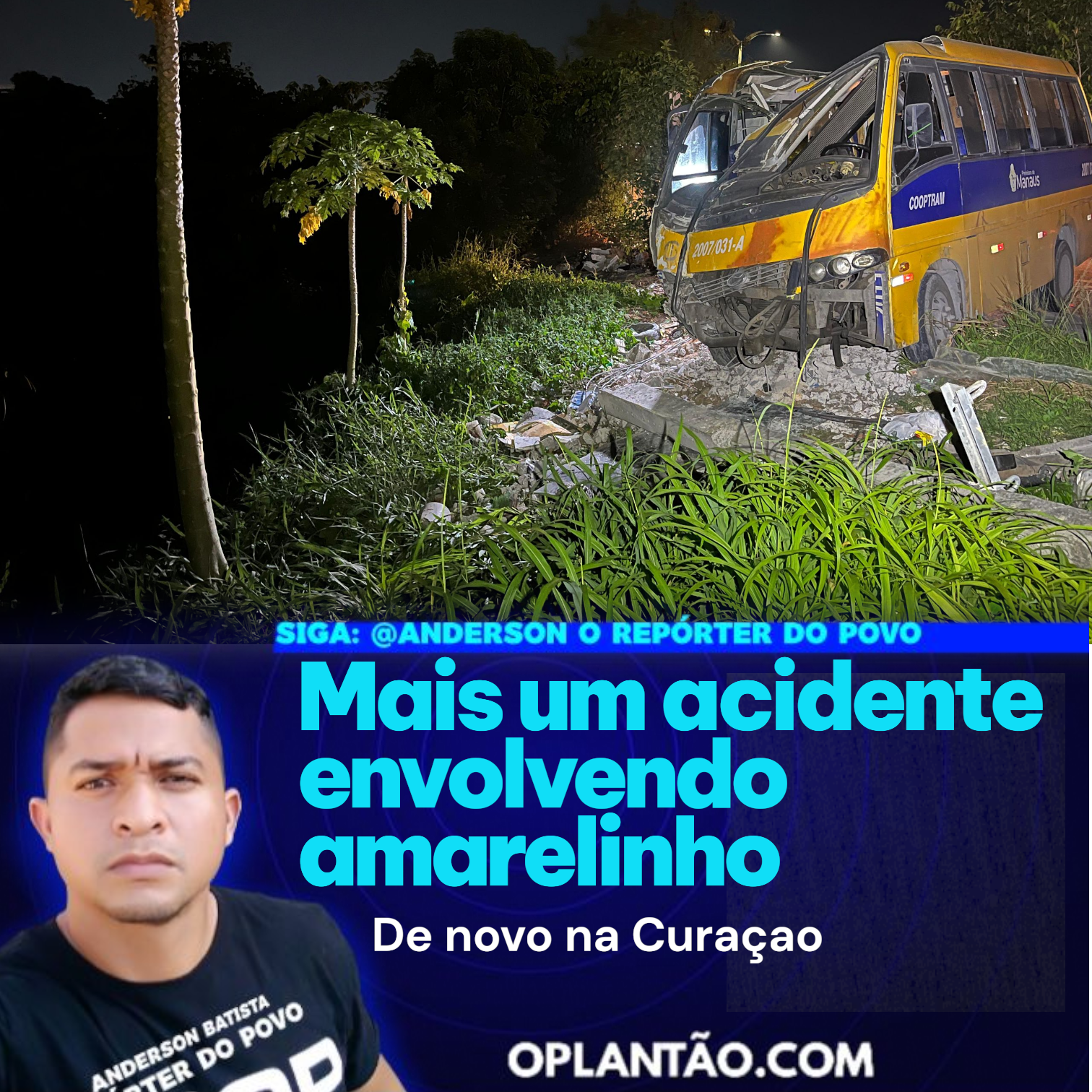 Na noite desta sexta-feira, mais um micro-ônibus do transporte alternativo, conhecido como amarelinho, se envolveu em um acidente na Avenida Curaçao, zona Norte de Manaus.De acordo com testemunhas, o veículo trafegava em alta velocidade quando perdeu o controle, derrubou um poste de iluminação pública e quase caiu em um barranco.No momento do acidente, não havia passageiros a bordo. Apenas o motorista e uma mulher estavam no micro-ônibus. A passageira sofreu uma fratura no braço e foi socorrida pelo Serviço de Atendimento Móvel de Urgência (SAMU), sendo encaminhada ao hospital mais próximo, no bairro Nova Cidade.Apesar do susto, a ocorrência não deixou vítimas fatais.